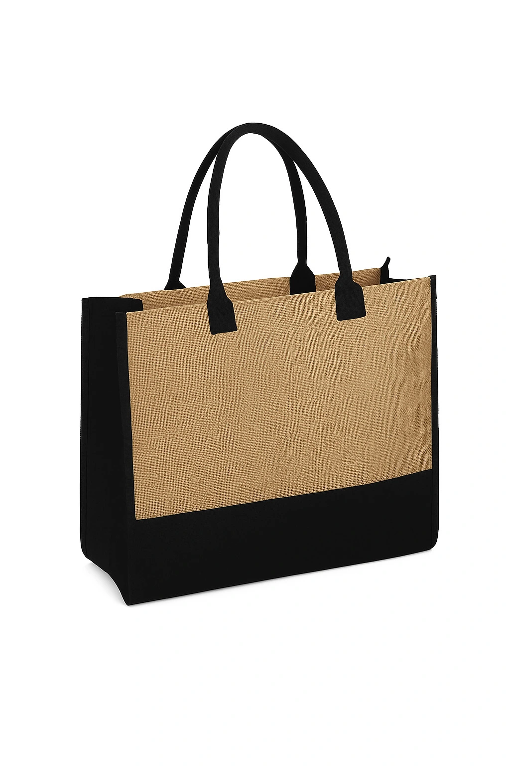 Sleek and structured, this jute carryall features a natural body contrasted with bold black trim and handles. Its spacious interior and timeless style make it the perfect companion for daily errands or stylish workdays.