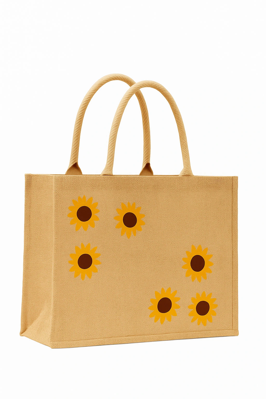 Brighten your day with the Sunny Bloom Jute Tote, featuring cheerful sunflower prints on durable, eco-friendly jute. Perfect for everyday errands, grocery runs, or casual outings—this spacious carryall makes sustainability feel joyful and stylish.