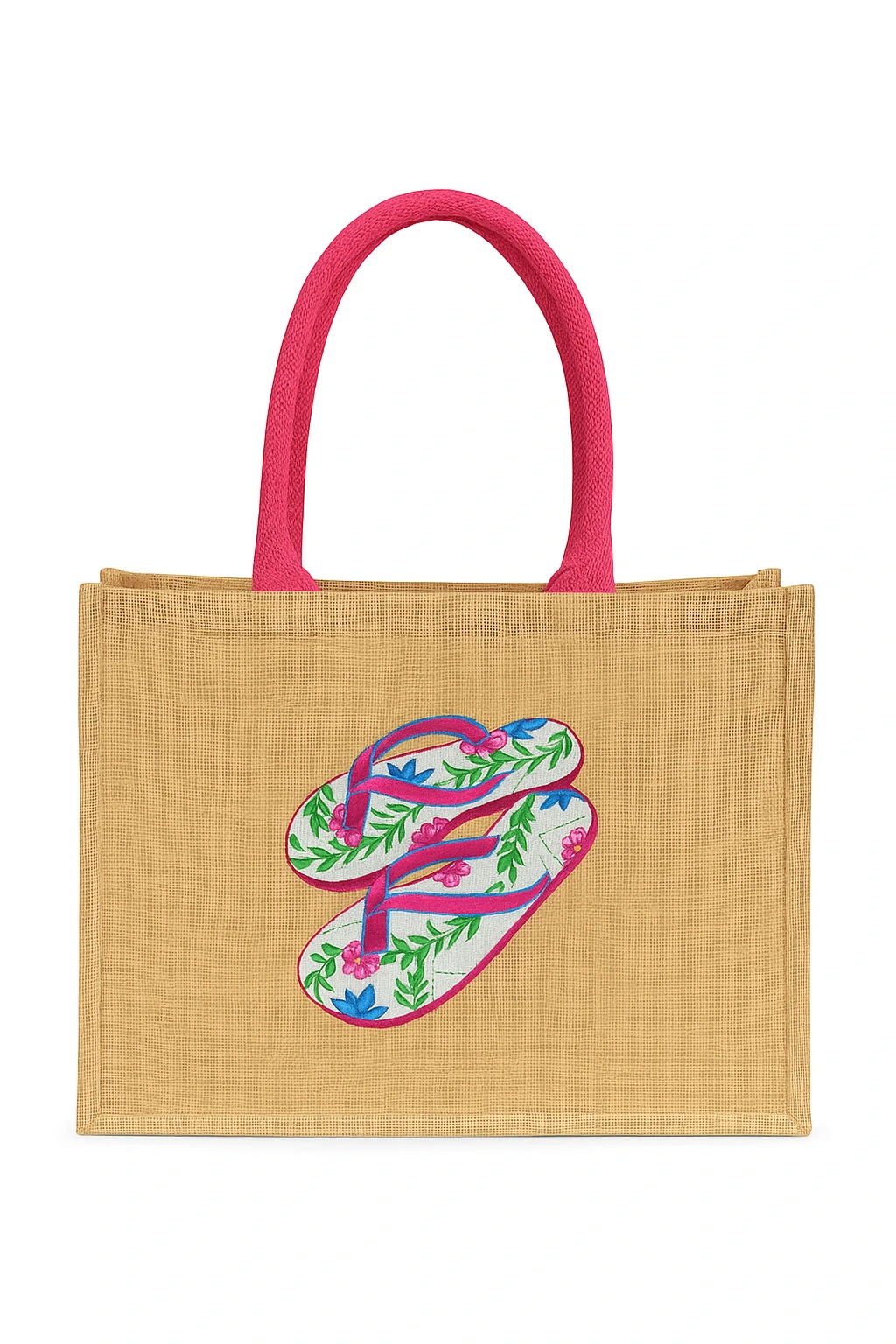 Step into summer style with this charming tote featuring a colorful flip-flop design and vibrant pink handles. Perfect for beach days, casual strolls, or gifting, it adds a playful pop of personality while supporting eco-conscious fashion.